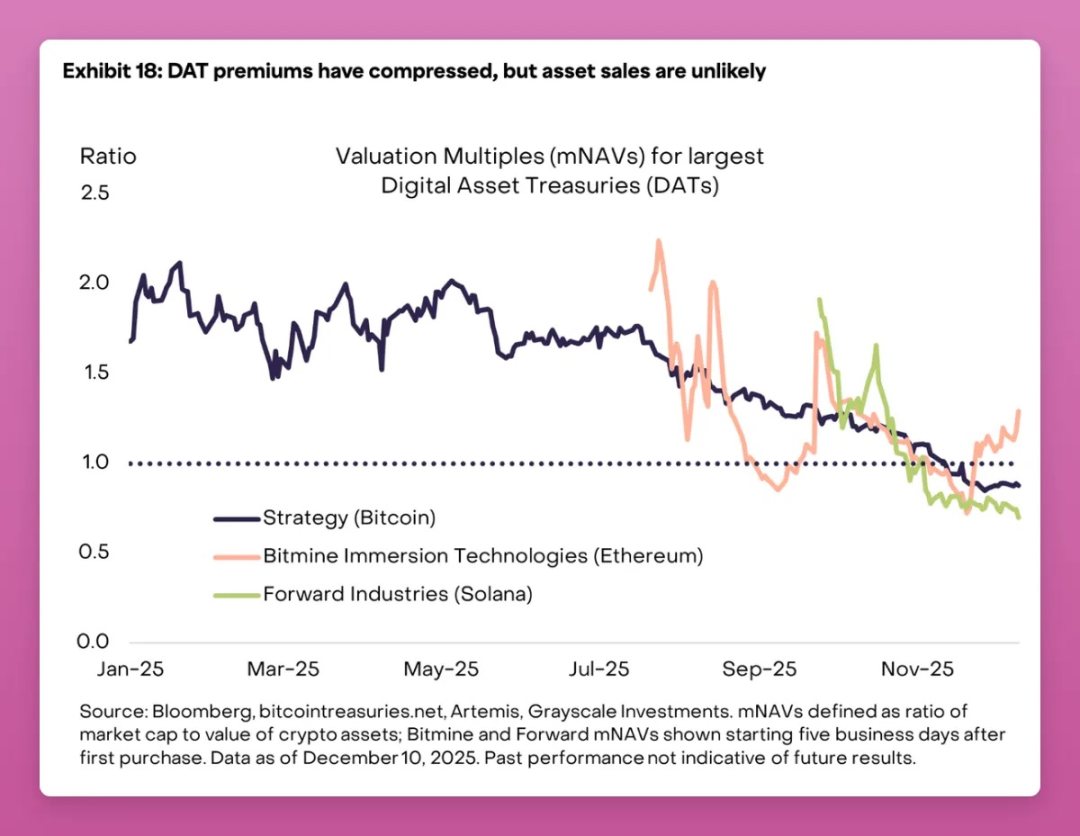 自 2025 年中期达到峰值后,DATs 的需求已明显降温:规模最大的几家 DATs,其「市值与净资产价值比率(mNAV)」已接近 1.0(即股价与净资产基本持平,无明显溢价)。