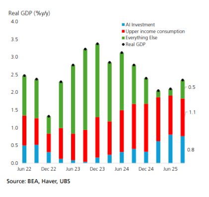 据追风交易台,瑞银在最新的研报中指出,在表面依然稳健的增长数据之下,美国经济的扩张基础正在迅速变窄:投资、消费与就业的边际改善,几乎全部系于人工智能这一单一主题。 一旦 AI 投资放缓或资产价格回调,当前扩张将失去核心支点。