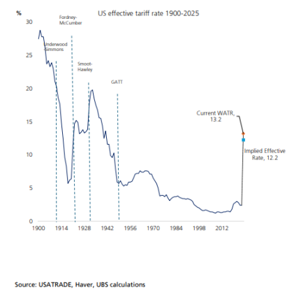 美国有效关税税率已升至 13.2%,接近 20 世纪 30 年代《斯姆特—霍利关税法》时期水平。按进口结构测算,实际有效税率约为 12.2%,相当于对经济征收了一次规模约 GDP 1.1% 的税负。