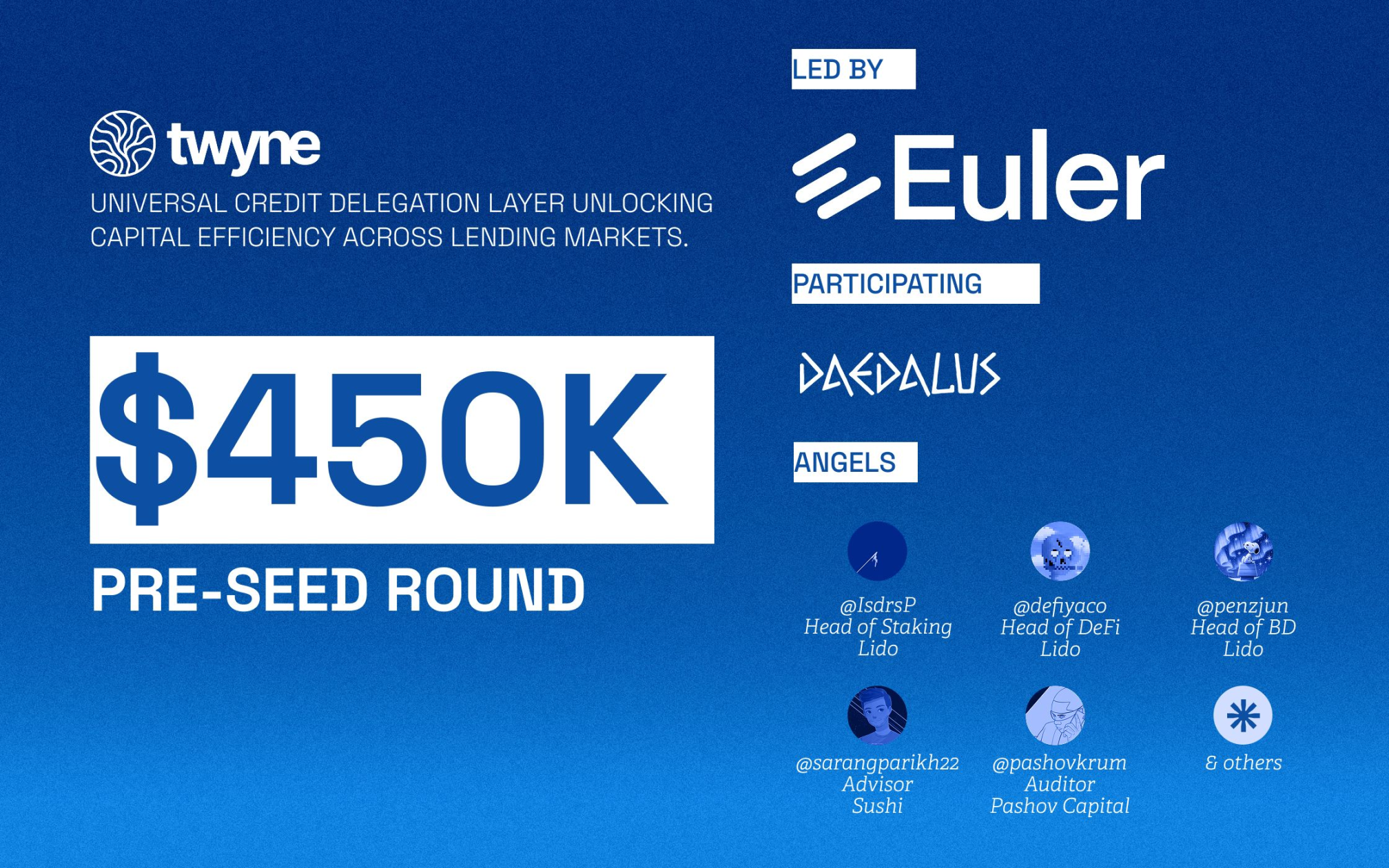 此前,twyne 于 2025 年 6 月完成 Pre-seed 轮融资。Euler Finance 领投,Daedalus 以及多位 DeFi 领域天使投资人参投。