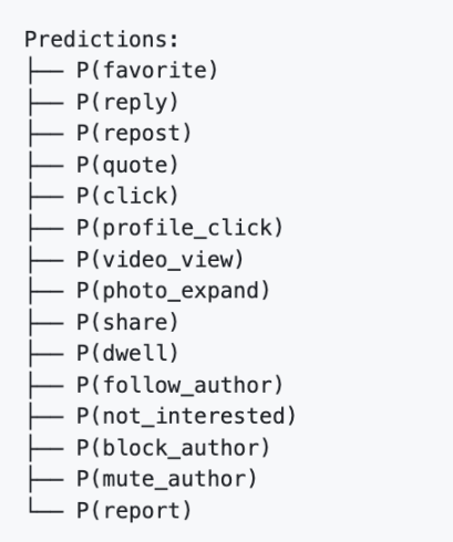 这是最关键的部分。基于 Phoenix Grok 的 Transformer 模型会盯着每一条过滤过后剩余的候选帖子,计算你对它做各种动作的概率。这是一个加分与减分的游戏: