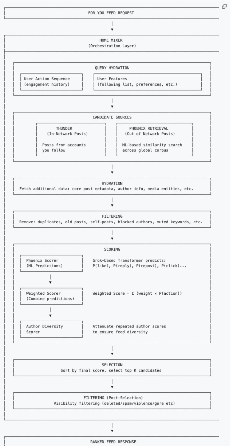 值得注意的是,新推荐算法中 Author Diversity Scorer(作者多样性打分器)通常会在 AI 算完最终得分之后介入。当检测到某一批候选帖子里,有同一个作者的多篇内容时,这个工具会自动「压低」该作者后续帖子的分数,让你刷到的作者更多元。