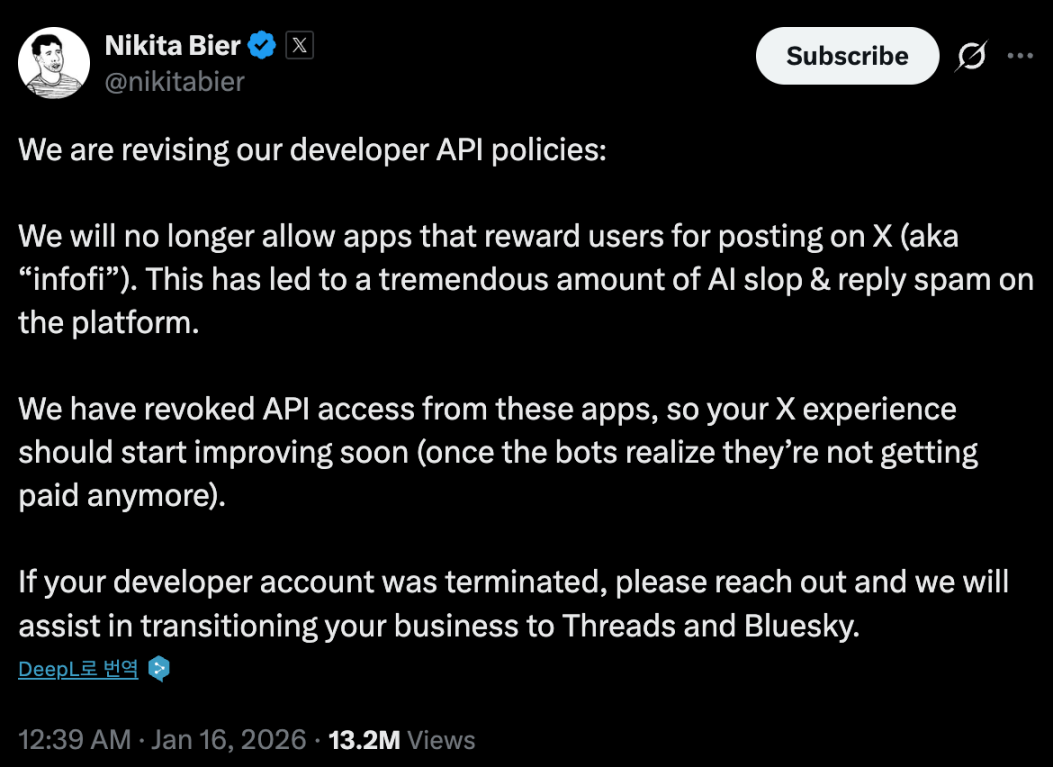 无论解释如何,X 平台的一个决定就终结了 InfoFi 生态系统。仅仅三天时间,一个完整的类别就崩溃了,毁于一家公司认为其损害平台质量的判断。