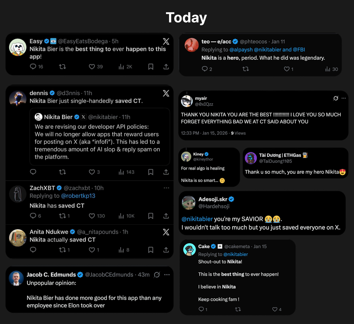 1 月 15 日,X 平台的产品负责人 Nikita Bier 发布了一条简短帖子,声明将不再允许在平台上提供奖励以换取发帖的应用程序。对于 InfoFi 项目来说,这标志着项目的终结。