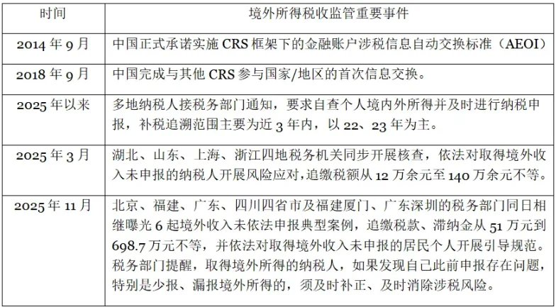 此次追溯补税事件,发生于中国实施 CRS 体系、税务机关开展一系列境外收入税务征管行动的背景之下(如下表)。从税务监管的客观逻辑看,税务机关实现精准稽查的前提是掌握涉税信息。中国在 2018 年首次开展 CRS 信息交换,所交换的正是 2017 年度的账户信息。据此,中国税务机关得以获取 CRS 交换框架下中国纳税人在境外银行、证券、信托等机构的账户余额、交易流水及持有人资料等,这使境外收入税务稽查追溯至 2017 年成为可能。