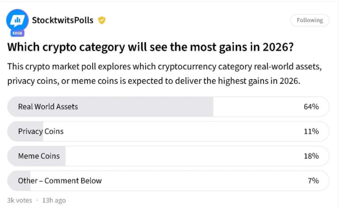 Stocktwits 最近的民调显示:64% 的投资者认为 RWA 将在 2026 年带来最强回报,远超 Meme 币的 12% 和隐私币的 8%。但这个数字背后藏着一个问题——当散户都开始喊着要配置 RWA 时,是真的认知升级了,还是只是 2025 年 Meme 崩盘后的PTSD 反应?