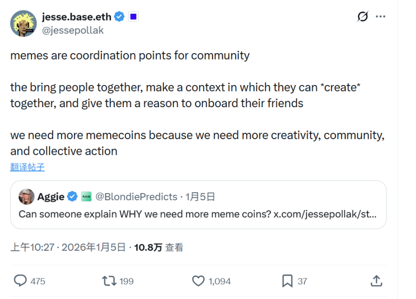 Base 链创始人 Jesse Pollak 提供了一个有趣的视角。他多次强调 Meme 不仅是投机工具,更是「链上文化的核心」。通过图片、视频、音乐等内容形式,Meme 能够吸引数百万新用户上链,成为 Web3 大规模采用的入口。