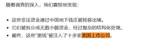 据 Capitalwatch 描述,其团队在追查中国倒闭 P2P 平台「团贷网」非法转移出的数十亿美元资金时,发现了惊人的资金链路。文章称:「这些非法资金通过中国地下钱庄被转移出境;它们被拆分成无数小额资金,经过复杂的结构化处理;最终,这些『黑钱』被注入了十多家美国上市公司。」