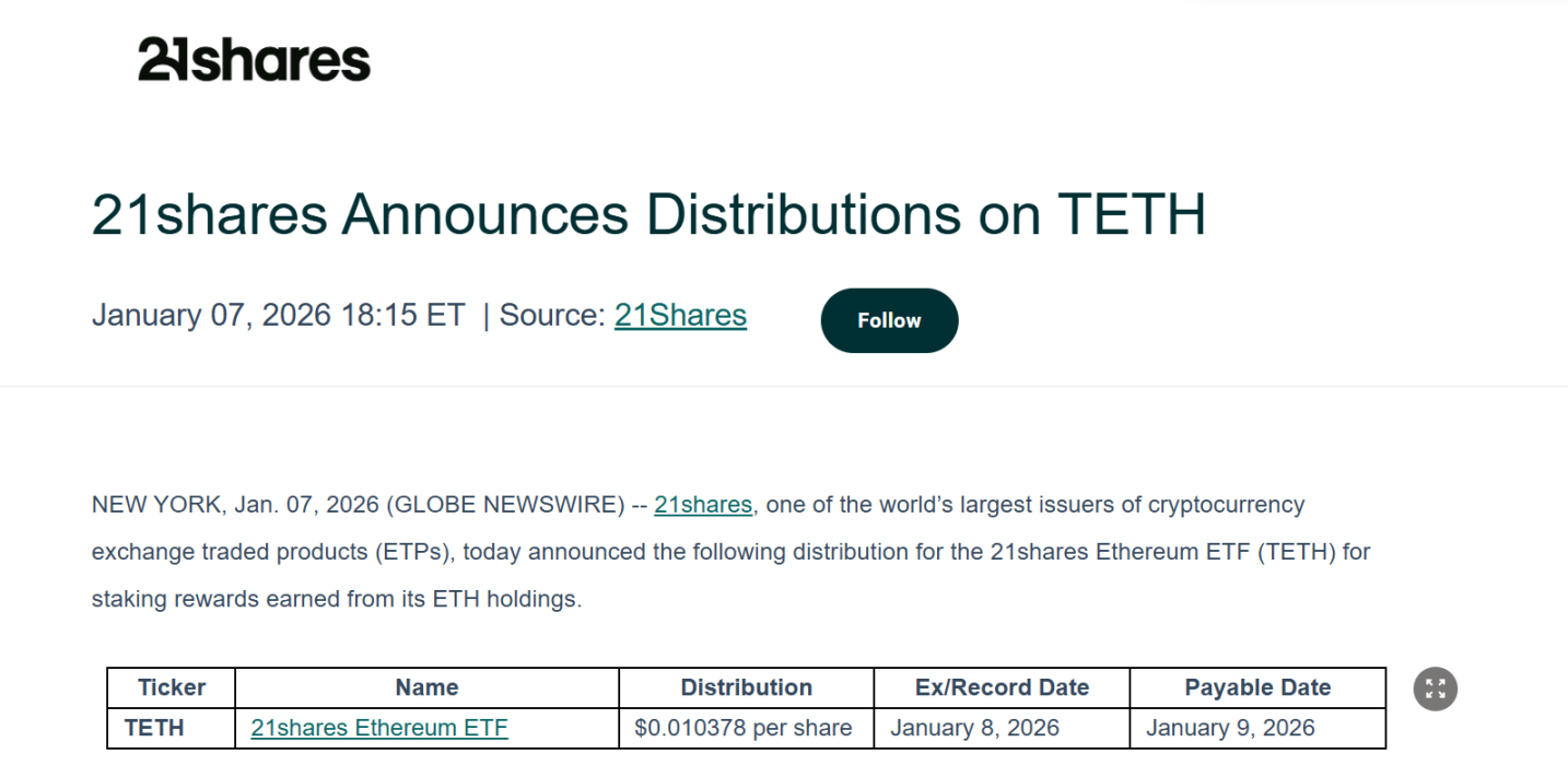 灰度也很快并非孤例,21Shares 旗下的以太坊 ETF 亦宣布,将向现有份额持有人分配通过质押 ETH 获得的收益。本次分配金额为每股 0.010378 美元,相关除息与派付流程已同步披露。