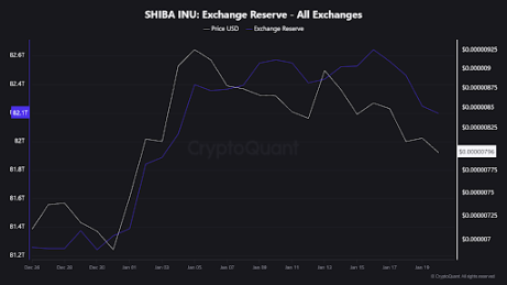 链上数据平台 CryptoQuant 的图表清晰地显示,从 1 月 16 日到 1 月 20 日,SHIB 的交易所储备从约 82.6 万亿枚下降至 82.23 万亿枚。这 3700 亿枚(约合当时价值 293 万美元)的代币,像退潮一样从流动性池中消失。