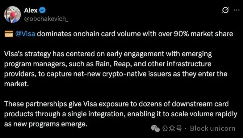 在这种情况下,Visa 早期就与中间层建立了合作关系,而 Mastercard 最初则更专注于与交易所合作。与大型发卡机构建立合作关系可以催生数十个信用卡项目,并开启一系列新产品的发布渠道。