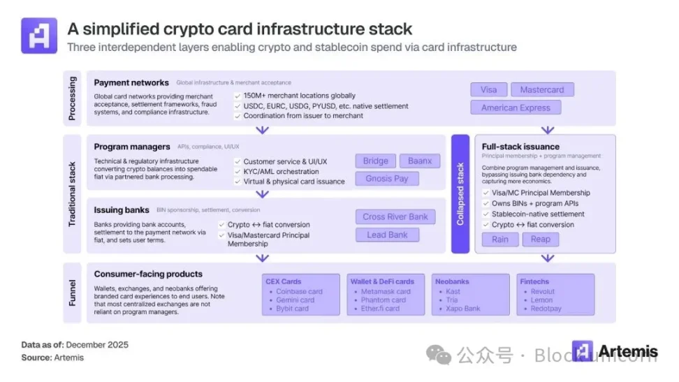 Artemis 的报告还显示,品牌的重要性远不及它们所整合的基础设施。报告指出,Visa 和 Mastercard 各自支持超过 130 个加密货币卡项目,但 Visa 却占据了超过 90% 的链上卡交易量。