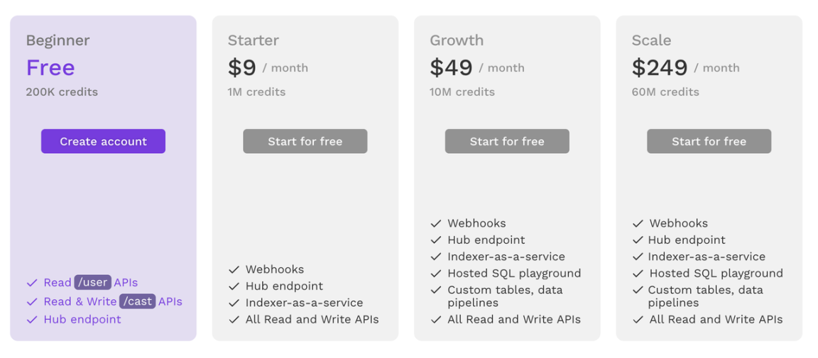 对于投资方而言,Farcaster 虽然愿景宏大,其运营成本极高且近期增长面临瓶颈。相比之下,Neynar 早早通过建立了清晰的商业路径,打开其定价页面与开发者文档便可发现,其通过向开发者收取 API 调用费、增值服务年费等方式,实现了健康的现金流,成为了生态内少有的具备「造血能力」的主体。