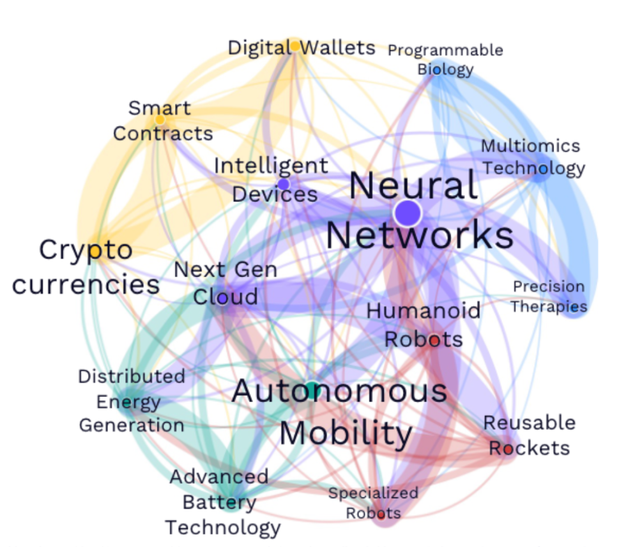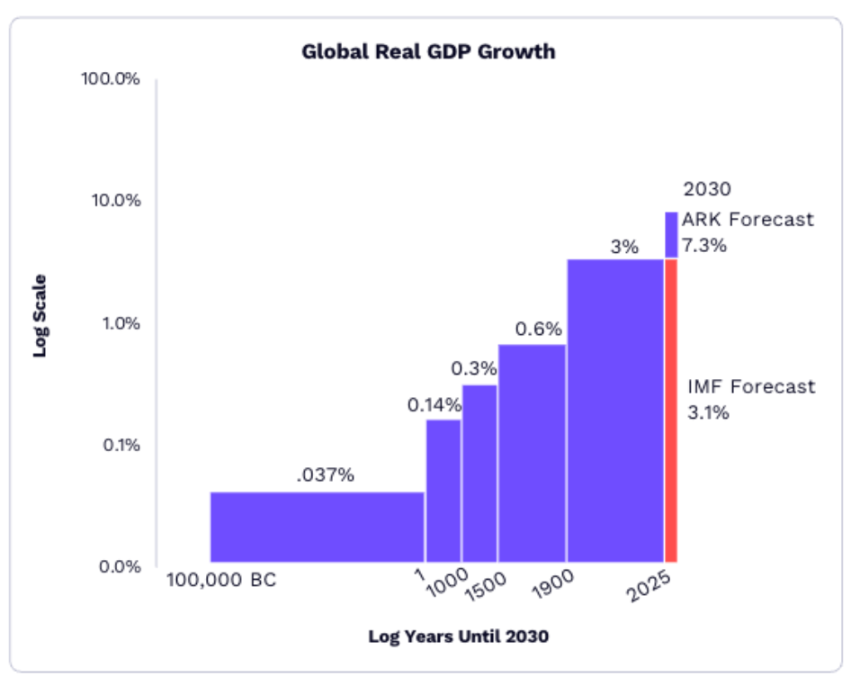 ARK 预测,2025-2030 年,仅资本投资一项就可能为全球实际 GDP 年均增速贡献 1.9 个百分点,若叠加其他创新的协同效应,实际增速可能较共识预期高出 4 个百分点以上。人工智能、区块链、机器人等五大创新平台将为全球经济提供结构性增长动力,提前识别并布局这些趋势的参与者,有望在「抢占未来」的竞争中占据先机。