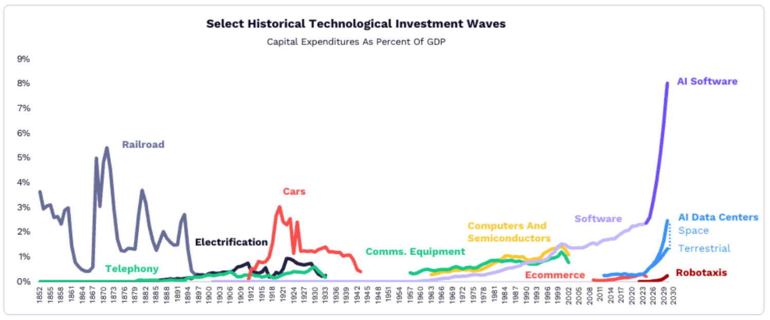 历史技术浪潮投资占 GDP 比重对比。蓝色柱状图显示当前创新时代占比达 4.5%,接近铁路时代峰值(5%),超越汽车与计算机时代