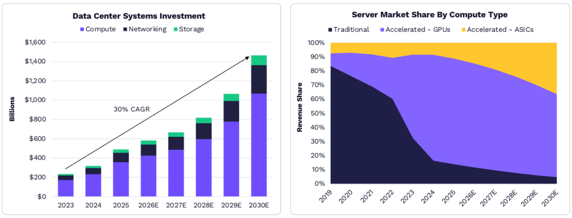 左图为 2025-2030 年全球数据中心投资增长;右图为按计算类型划分的服务器市场份额