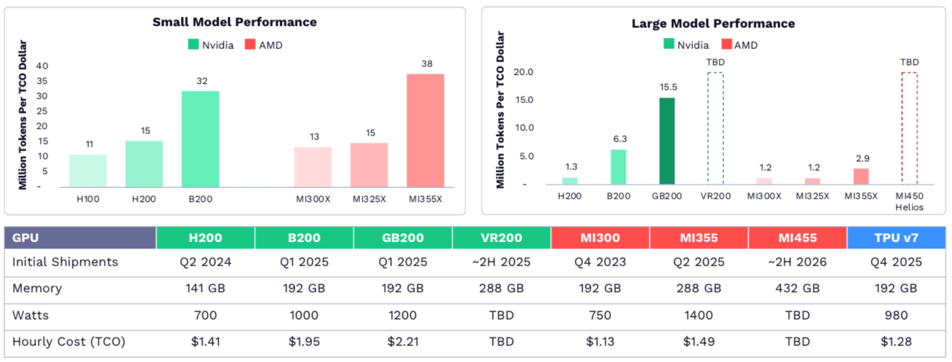 2025 年 AI 芯片市场份额 —— 表中,绿色代表英伟达、红色代表 AMD、蓝色代表谷歌