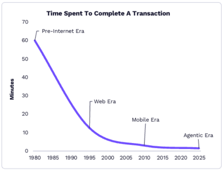不同时代消费决策时长对比 —— 时间轴从左到右为互联网前时代(1980s)、Web 时代(2000s)、移动时代(2010s)、AI 时代(2025),标注时长 60 分钟→15 分钟→5 分钟→1.5 分钟