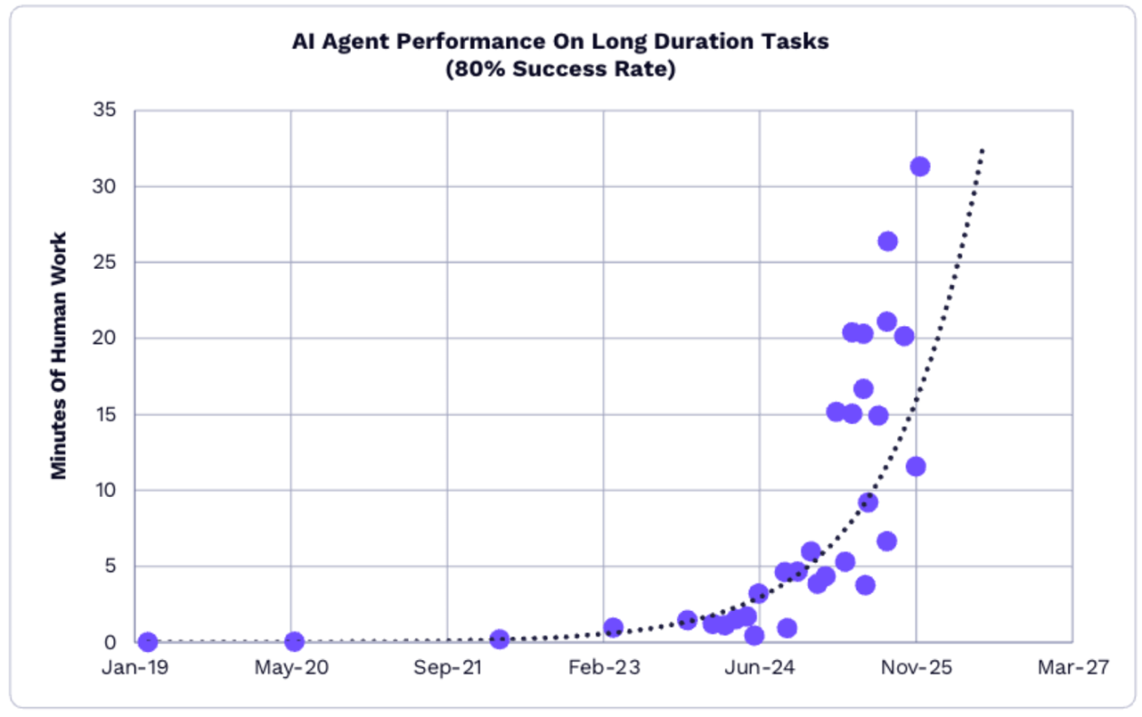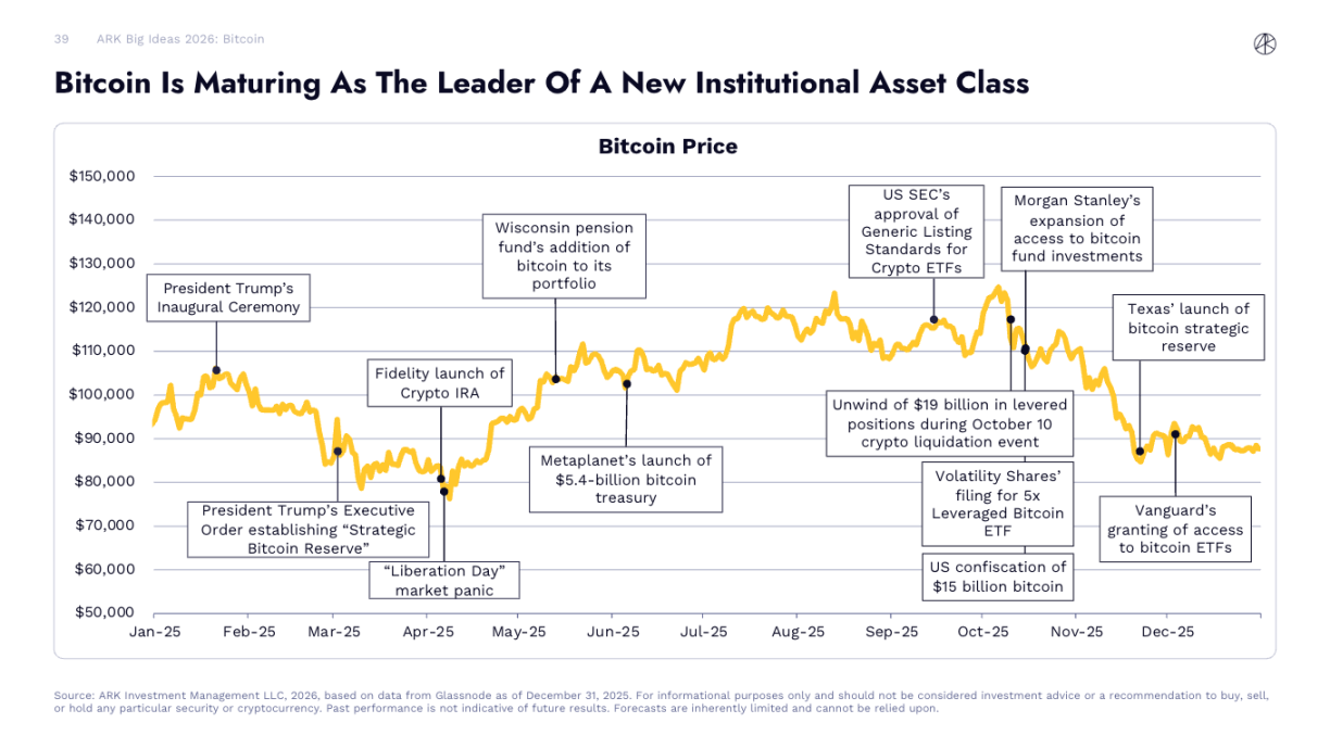 编者按:本文选编自「木头姐」Cathie Wood 旗下 ARK Invest 发布的旗舰报告《Big Ideas 2026》。原文覆盖 AI、区块链、生物科技、太空探索等 13 个核心创新趋势,由于内容过长,本文将重点编译加密货币与 AI 两大板块内容。以下是编译内容: