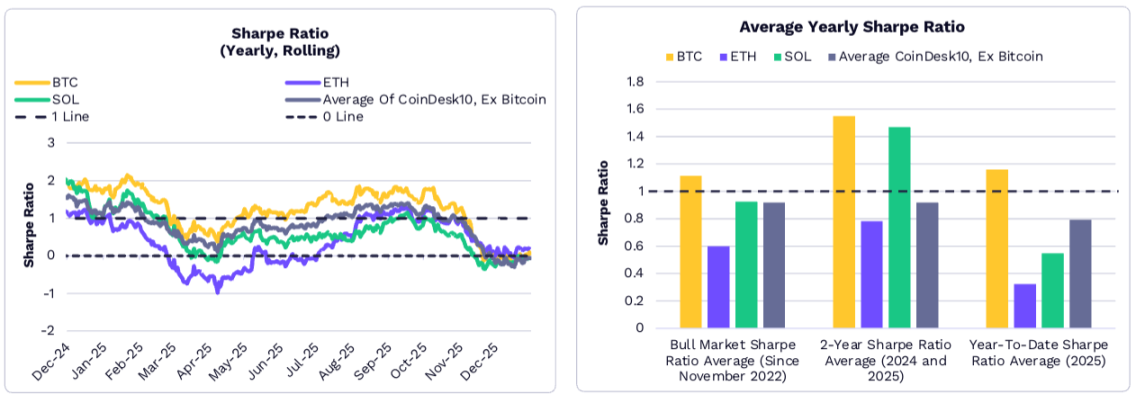 左图为 2024 年 12 月 - 2025 年 12 月比特币与其他加密货币的滚动年化夏普比率;右图为不同时间段(2025 年、2024-2025 年、2022 年 11 月至今)的年均夏普比率对比。