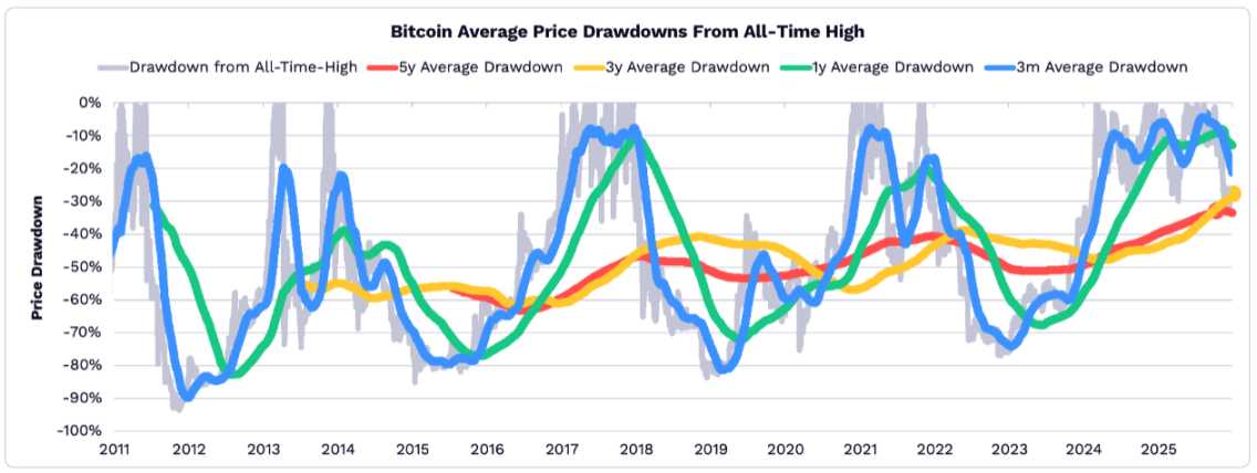 随着比特币避险资产属性逐渐增强,其波动性持续降低。2025 年,从 5 年、3 年、1 年和 3 个月四个时间维度来看,比特币价格相对于历史高点的平均回撤幅度均低于历史水平,成为历史上各时间维度回撤幅度最浅的一年。