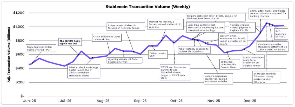 2025 年 6 月 - 12 月稳定币周度调整后交易量(剔除矿工可提取价值与交易所内交易)
