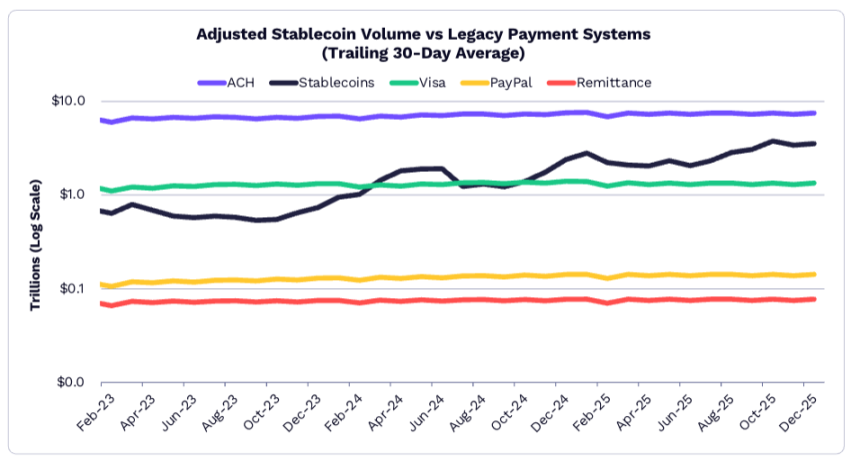 2025 年 12 月,稳定币调整后交易量的 30 日均值达 3.5 万亿美元,是 PayPal、汇款业务与 Visa 交易量总和的 2.3 倍。其中,Circle 的 USDC 占据约 60% 的调整后交易份额,Tether 的 USDT 占比约 35%。2025 年,稳定币总供应量从 2100 亿美元增长 50% 至 3070 亿美元,USDT 与 USDC 分别占 61% 和 25%;Sky Protocol 是除二者外唯一市值超 10 亿美元的稳定币,PayPal 的 PYUSD 市值则增长超 6 倍至 34 亿美元。