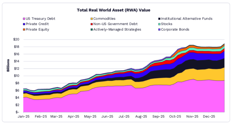 2025 年 1 月 - 12 月各品类代币化现实资产(RWA)市值变化(含美国国债、大宗商品、私募信贷等)。