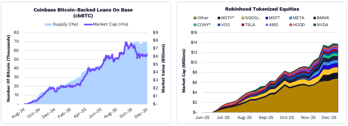 传统金融与科技企业纷纷推出专属链上基础设施,以支撑自身代币化业务:Circle 推出 Layer 1 区块链「Arc」,Coinbase 上线 Base 区块链与 cbBTC(比特币锚定代币),Kraken 推出「Ink」网络,OKX 开发「X Layer」,Robinhood 打造「Robinhood Chain」,Stripe 推出「Tempo」等。这些平台主要用于支持比特币质押贷款、代币化股票与 ETF、稳定币支付通道等业务,例如 Coinbase 在 Base 上推出的比特币质押贷款业务,2025 年底供应量已超 8 万枚比特币;Robinhood 的代币化股票(如 GOOGL、MSFT、NVDA 等)市值在 2025 年 6 月 - 12 月间快速增长,部分标的市值超 1 亿美元。