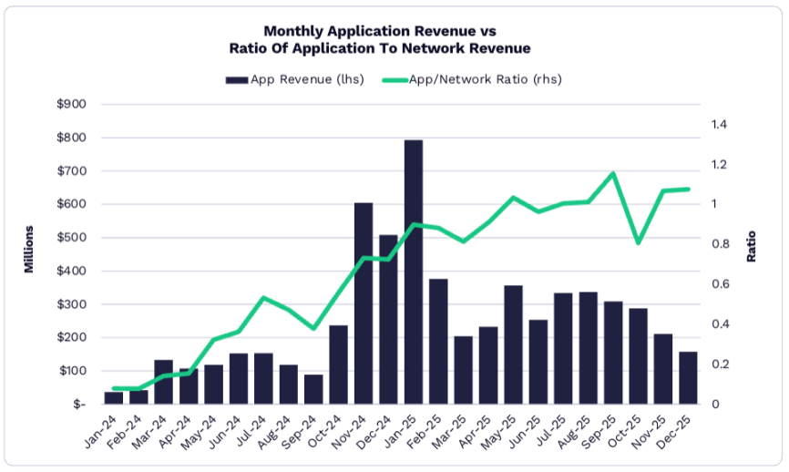 2024 年 11 月 - 2025 年 12 月 DeFi 应用月营收与「应用 / 网络收入比率」变化,显示应用端收入占比持续提升。