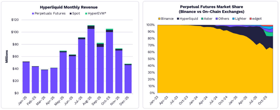 以 Hyperliquid 为代表的 DeFi 衍生品平台,正从中心化交易所(如币安)手中抢占永续合约市场份额。2025 年,Hyperliquid 的月营收从 1 月的约 500 万美元增长至 12 月的超 1 亿美元,永续合约交易量占全球市场的比例从不足 1% 提升至 8%;同期,币安的永续合约市场份额从 85% 降至 70% 以下,Aster、Lighter 等其他 DeFi 衍生品平台也实现份额增长。这一趋势表明,用户对「无需信任中介、资产自主掌控」的衍生品交易需求显著提升,DeFi 在交易体验与成本上的优势逐渐凸显。