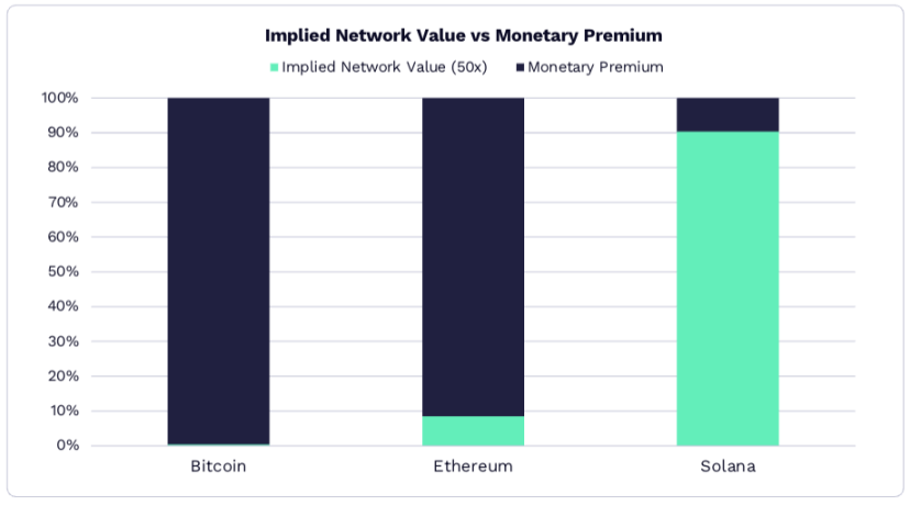 Layer1 区块链(如比特币、以太坊、Solana)的价值逻辑正从「收入驱动」转向「货币属性驱动」:通过 50 倍高增长营收倍数测算,以太坊超 90% 的市值源于其「货币溢价」(作为链上价值存储与交换媒介的属性),而非网络收入;Solana 尽管 2025 年产生 14 亿美元网络收入,但其 90% 的市值仍由货币属性支撑。ARK 认为,未来仅有少数数字资产能保留货币属性,成为高流动性的价值存储工具,其余资产将更多依赖实际应用场景的收入支撑估值。
