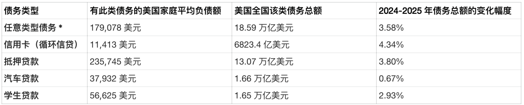 * 注:根据纽约联邦储备银行的定义,此类债务可包括抵押贷款、房屋净值信贷额度、汽车贷款、信用卡、学生贷款及其他家庭债务。