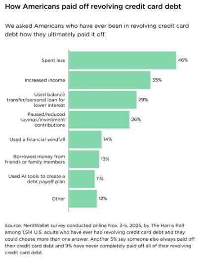 这是 NerdWallet 联合哈里斯民意调查(2025 年 11 月 3-5 日)对 1514 名曾背负循环信用卡债务的美国成年人的调研,受访者可多选还款方式。主要还款方式及占比: