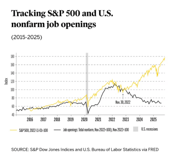 标普道琼斯指数图表:显示 2022 年 11 月后,股市持续走高但就业岗位数量骤降,并用「衰退区间」标注了劳动力市场疲软的阶段