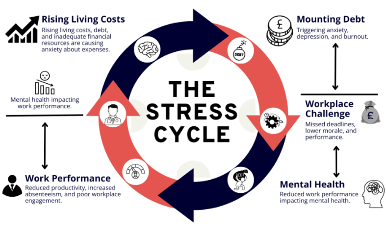 展示「压力循环」的示意图:生活成本上升和债务累积引发焦虑、抑郁,导致心理健康恶化,进而陷入恶性循环