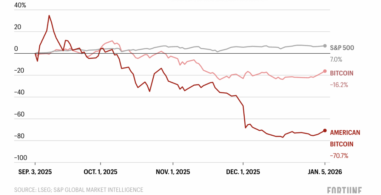 由于投资者对美国经济走软的担忧加剧,截至 2026 年 1 月中旬,比特币价格较秋中峰值下跌超 25%,American Bitcoin 的股价也随之一路走低,较 9 月初首次公开发行时暴跌超 70%。