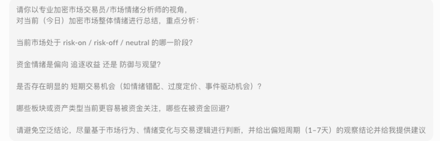 有一日我突发奇想,想用同一份提示词同时询问 Surf.AI 与 ChatGPT,判断当前加密市场处在什么风险阶段,并据此给出具体的交易建议。我想要知道一下,这两种 AI 在 crypto 研究里,到底区别在哪里。