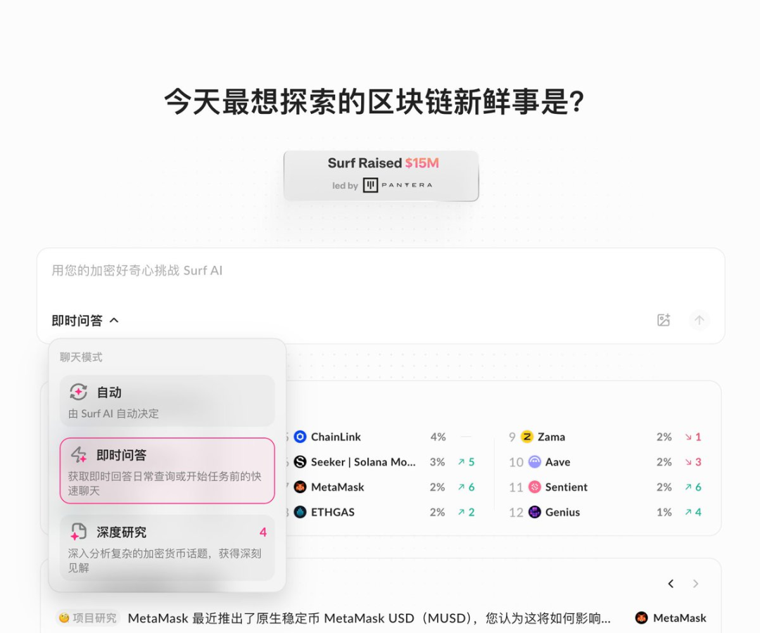 在过去的 AI 产品浪潮中,很多人质疑 Web3 的 没有用户、没有 DAU(每日活跃用户)。Surf 这类产品的意义,恰恰在于用真实使用去回应这个问题,如果用户每天真的在用它做研究、查项目,它就不再只是叙事,而更接近一款工具。