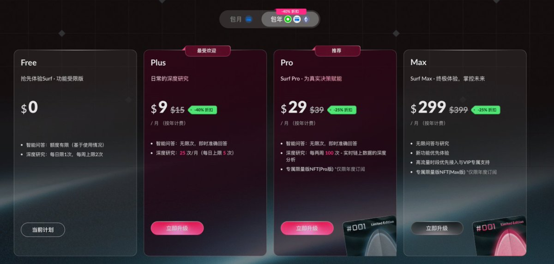 产品定价方面,Surf 目前是典型的订阅制:提供 Free / Plus / Pro / Max 多档方案,差别主要体现在 Research 额度、功能完整度以及高峰期优先级等权益。对于重度使用 / 撸空投用户,也可以选择订阅年度会员来获取对应的 NFT,或许会跟未来 TGE 空投权益相绑定。