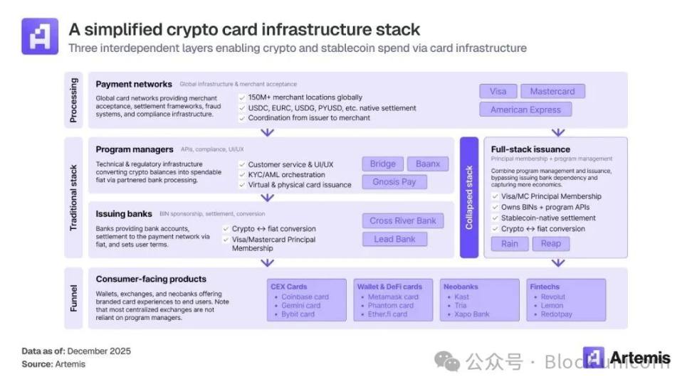 Artemis 的报告还显示,品牌的重要性远不及它们所整合的基础设施。报告指出,Visa 和 Mastercard 各自支持超过 130 个加密货币卡项目,但 Visa 却占据了超过 90% 的链上卡交易量。