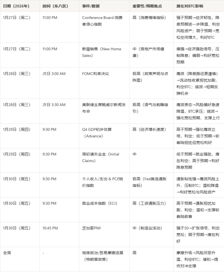 下周市场将聚焦零售销售、PPI、初请失业金数据组合,若数据整体偏软,将强化短期降息预期,利好 BTC 上行测试 100k;反之则利空延续。而 1 月 27-28 日的 FOMC 利率决议及鲍威尔发布会,将成为决定短期市场走势的核心节点。