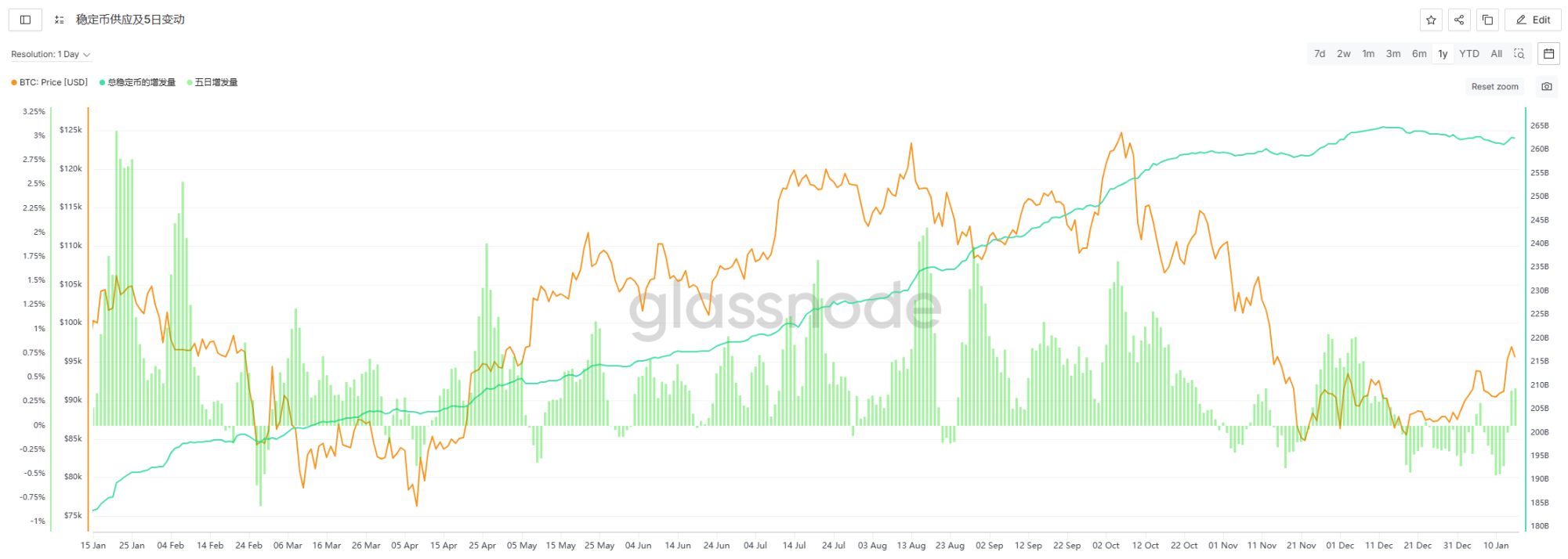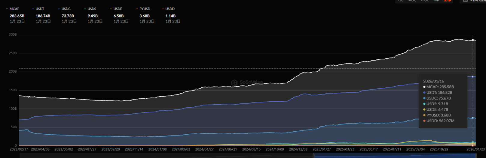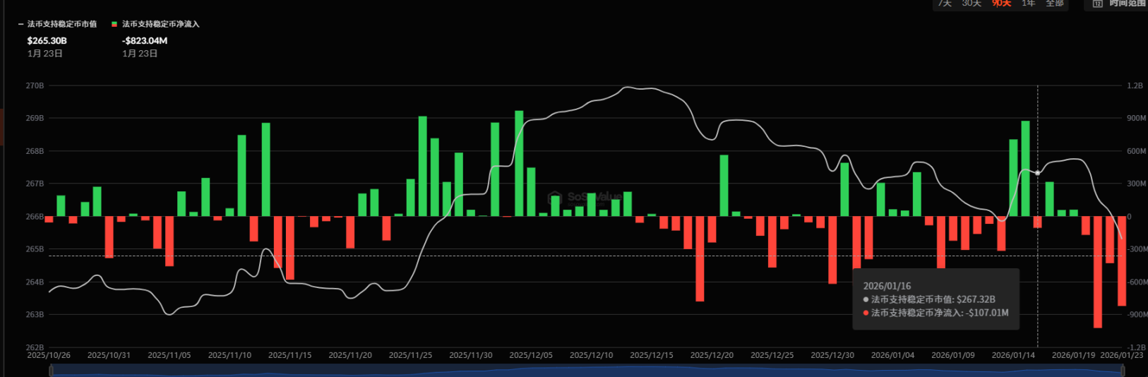 本周(1.17-1.23)稳定币总市值回落至 2605.03 亿美元,单周净流出 19.41 亿美元,创下 2025 年 10 月大盘下跌以来最大单周负增发,资金入场情绪显著降温,与 BTC 的加速回落形成同步。后续大盘能否止跌企稳,需重点关注稳定币增发水平的回暖情况。
