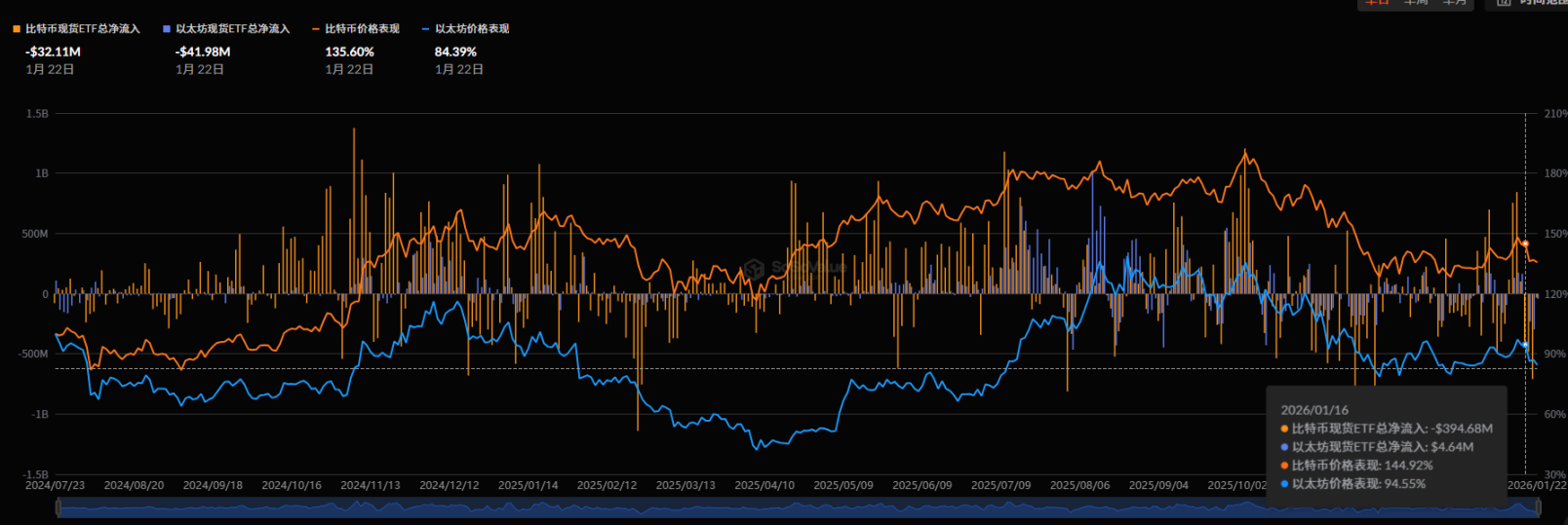 本周 BTC ETF 单周净流出 16.1888 亿美元,较上周 15.6421 亿美元的净流入大幅反转,资金流出规模环比下降 31.8309 亿美元,与 BTC 价格回落联动。1.16-1.20ETF 单日流出逐日递增,BTC 跌幅同步扩大;但 1.21ETF 单日流出扩大至 7.0871 亿美元时,BTC 未再创新低,表明短期大幅下跌动能有限,后续反弹的关键信号为 ETF 恢复单日净流入。