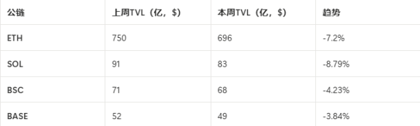 1、四大公链 TVL 现状:本周链上 TVL 小幅上涨,低于价格上涨幅度。