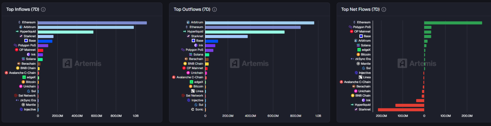 2、链上资产流向:DeFi 桥接资产流向分化,ETH 链净流入规模最大,STRK、HYPE 链流出最多;稳定币小幅增发,ETH 链 DeFi 资金出现明显腾挪,流向其他板块。