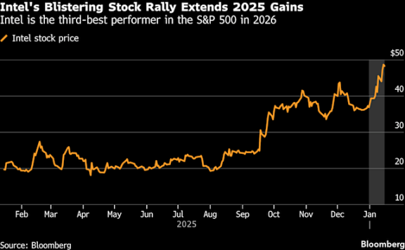 2025 Q4 - 2026 Q1 的 INTC 股价走势(来源于 Yahoo Finance / TradingView)