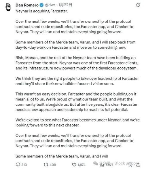 上周三,去中心化社交平台 Farcaster 的联合创始人 Dan Romero 宣布,Farcaster 最早也是最具影响力的客户端之一 Neynar 将收购 Farcaster。作为此次过渡的一部分,协议合约、核心代码库、官方应用程序以及(甚至)Clanker 的所有权将分阶段转移。与此同时,Romero 指出,创始团队将退出日常运营,以便专注于新的项目。