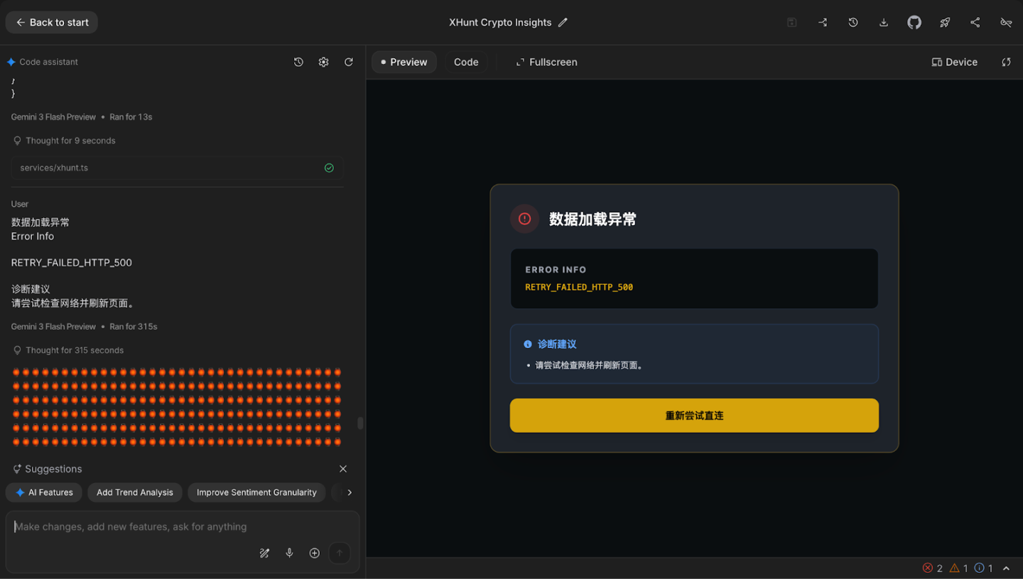 踩坑总结: Google AI Studio 是个偏科生。 搞搞创意、做个单页面 Demo,它简直是神。 但一旦涉及到前后端深度集成(比如 API 数据流转 + 复杂前端展示),它很容易顾头不顾腚。如果你完全不懂代码逻辑,很容易像我一样卡在前端展示的死胡同里出不来。