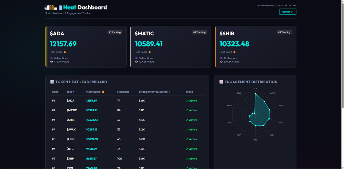 实时数据卡片:顶部展示了 24 小时内推文总数、互动总数、活跃 KOL 数、 市场情绪指数。不用看具体内容,并对比前 24 小时数据,瞄一眼红色还是绿色,就知道今天市场是恐慌还是贪婪。